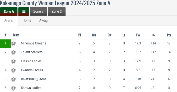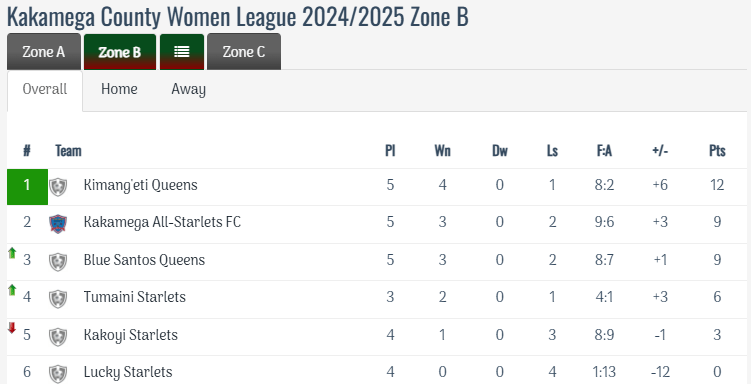Kimangeti Queens currently dominate Zone B of the league, sitting firmly at the top with an impressive total of 12 points accumulated after 5 matches played. Their consistent performance has set the pace for the competition, showcasing their strong teamwork and tactical prowess on the field. Close on their heels is Kakamega All Starlets, who, despite being in second place, have managed to secure 9 points from their 5 outings, indicating a competitive spirit and potential for climbing the ranks further. Not far behind in the standings, Blue Santos Queens also share the same 9 points but find themselves in third position due to a slightly inferior goal difference, having scored fewer goals than the All Starlets, a detail that underscores the fine margins that can determine league standings. Rounding out the top six, Tumaini Starlets hold the fourth position while Kakoyi Starlets and Lucky Starlets follow closely behind in fifth and sixth places respectively, each striving to improve their standings as the league progresses and matches continue to unfold.