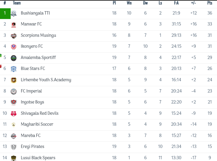 In Zone E, there is significant action in the 14 teams league as Bushiangala TTI leads the table with 36 points after 18 matches, showcasing an impressive performance that has solidified their top position. Following closely is Manwar FC, which has been formidable this season with 33 points, displaying consistent skill and determination in their gameplay. Right behind them, Scorpions Musingu, currently accumulating 31 points after only 16 matches, has shown promising potential, making them a team to watch as a serious title contender this season. Their recent performances have left fans excited, with high expectations for their upcoming fixtures. At #4 is Ikonyero FC, demonstrating solid form that keeps them within reach of the top three. #5 Amalemba Sportiff and #6 Blue Stars FC are both battling for crucial points to maintain their competitive edge, while #7 Lirhembe Youth Soccer Academy continues to develop young talent on the pitch. Following closely at #8 is FC Imperial, known for their unpredictable playstyle, which has led to thrilling matches this season. As we move down the table, #9 Ingotse Boys and #10 Shivagala Red Devils are in mid-table positions but are eager to climb higher in the standings. #11 Magharibi Soccer is striving to gather momentum, while the bottom three positions feature #12 Mareba FC, #13 Eregi Pirates, and #14 Lusui Black Spears, all of whom are desperately seeking points to avoid relegation and improve their standings in the league.