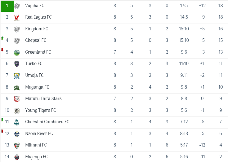 In zone B, which comprises teams from Lugari Sub-County, it’s a thrilling and competitive race among the top four teams in the league of 14 teams, showcasing the excitement and unpredictability of local football. Red Eagles currently enjoy a significant 7-point lead with an impressive total of 45 points atop the table, reflecting their consistency and strong performance throughout the season. Following closely in second place is Vuyika FC, accumulating 38 points after 20 matches, a testament to their resilience and determination to challenge for the title. Maturu Taifa Stars holds down the third spot with 36 points, demonstrating their ability to compete at a high level. They are only separated from the fourth-placed Chepsai FC by a mere six goals difference, even though both teams are tied on points, enhancing the drama as each game unfolds. Greenland FC sits in fifth place, showing promise with their solid gameplay, while Chekalini FC at sixth is striving to break into the top ranks. Mugunga FC is in seventh, and Umoja FC is at eighth, both looking to improve their standings with strong performances in the matches to come. Kingdom FC and Young Tigers FC follow in ninth and tenth places, respectively, as they aim to climb the table. Meanwhile, in the bottom three, we find Nzoia River at #12, who are trailing by 7 points from eleventh-placed Turbo FC, highlighting their struggle this season. Mlimani FC is positioned at #13, fighting hard to avoid relegation, and unfortunately, at the bottom of the table, #14 is Majengo FC, who are facing significant challenges as the season progresses, which makes the final matches of the league particularly crucial for all teams involved.