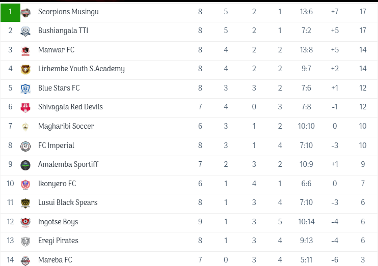 In Zone E, there is significant action in the 14 teams league as Bushiangala TTI leads the table with 36 points after 18 matches, showcasing an impressive performance that has solidified their top position. Following closely is Manwar FC, which has been formidable this season with 33 points, displaying consistent skill and determination in their gameplay. Right behind them, Scorpions Musingu, currently accumulating 31 points after only 16 matches, has shown promising potential, making them a team to watch as a serious title contender this season. Their recent performances have left fans excited, with high expectations for their upcoming fixtures. At #4 is Ikonyero FC, demonstrating solid form that keeps them within reach of the top three. #5 Amalemba Sportiff and #6 Blue Stars FC are both battling for crucial points to maintain their competitive edge, while #7 Lirhembe Youth Soccer Academy continues to develop young talent on the pitch. Following closely at #8 is FC Imperial, known for their unpredictable playstyle, which has led to thrilling matches this season. As we move down the table, #9 Ingotse Boys and #10 Shivagala Red Devils are in mid-table positions but are eager to climb higher in the standings. #11 Magharibi Soccer is striving to gather momentum, while the bottom three positions feature #12 Mareba FC, #13 Eregi Pirates, and #14 Lusui Black Spears, all of whom are desperately seeking points to avoid relegation and improve their standings in the league.