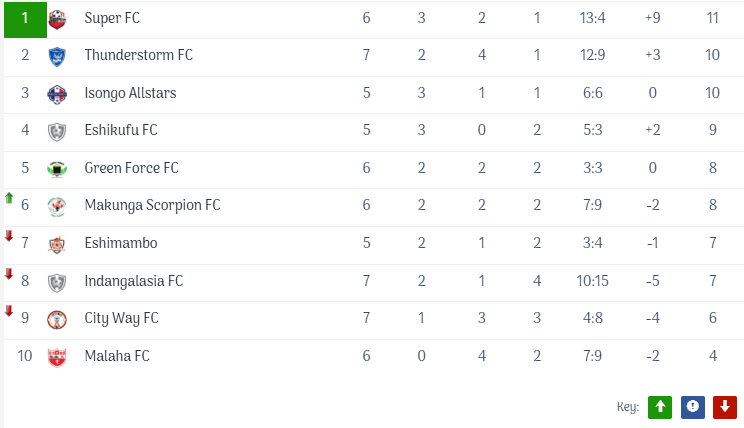 Eshikufu FC tops the zone F 10 teams table with an impressive total of 35 points after competing in 15 matches, showcasing their strong performance and consistency throughout the season. Super FC comes in a solid second place, holding a distance of 22 points after 13 matches, indicating a commendable effort, but they face tough competition. Notably, they are tied in points with #3 Makunga Scorpions, who have played 14 matches, yet they fall short due to a 9-goal difference, highlighting the competitive nature of the league. At #4 is Isongo Allstars, who have shown potential this season, while #5 Thunderstorm FC continues to battle for a higher position. Following closely in #6 is Green Force FC, and #7 is Malaha FC, both striving to improve their standings as the season progresses. Meanwhile, in the bottom three, we find #8 Eshimambo FC, #9 City Way FC, and #10 Indangalasia FC, all of whom are keenly looking to turn their fortunes around and push for better results in the remaining matches.