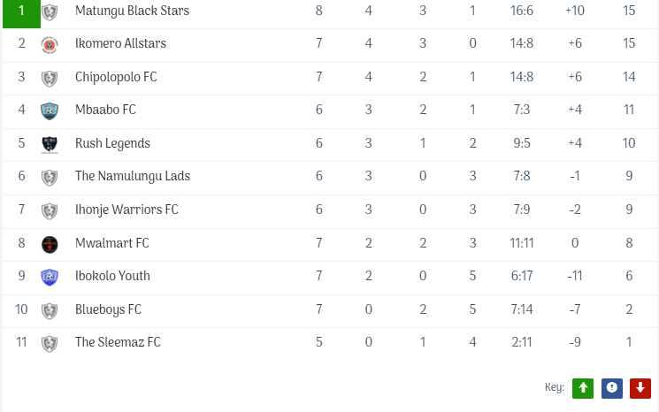 Elsewhere in zone D, which comprises 11 teams from Shinyalu, there was notable action as Spitfire FC tops the league with 27 points after 14 matches, showcasing a strong performance that has positioned them as the team to beat. They have two games in hand from second-placed Shisokoro FC, who also have 27 points after 16 matches but trail Spitfire by seven goals, highlighting the offensive prowess of Spitfire. The battle for supremacy continues as Shisokoro FC is only 2 points ahead of third-placed Tsunami FC Mukumu, who have played just 13 matches and accrued 25 points, indicating they could quickly climb the rankings if they maintain their form. The competitiveness of this group is truly on another level, as #4 Sande FC holds 24 points from 16 matches, proving they are a formidable contender in this fierce race. Just behind, fifth-placed Mundulu FC follows closely with 22 points from 14 matches, making every upcoming match crucial for their aspirations. At #6, Shibuye FC has played 16 matches and garnered a total of 21 points; however, they find themselves in a tense situation as they are tied in both points and goal difference with #7 Young Simba, who still have two matches at hand, adding further intrigue to the competition. At #8 is Tarino FC with only 13 points, separated from #9 Lucky Stars FC by goal difference after both teams have played 15 matches. In the last two spots, #10 Shidodo FC has a total of 12 points, while at the bottom, Kambiri Township struggles to find their footing with just 10 points, making this league season one filled with excitement and unpredictability as teams jockey for position in the standings.