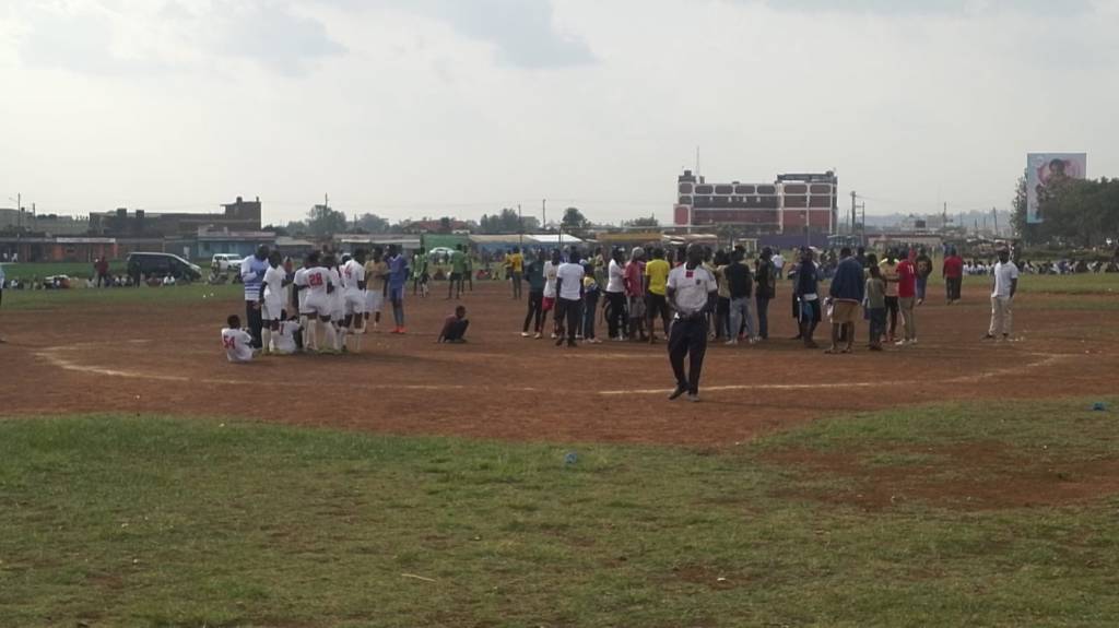 Huruma Starlets in white watch from safe distance as their match vs the Kakamega side The Iron Ladies was disrupted by rowdy men teams who occupied the field and disrupted the event