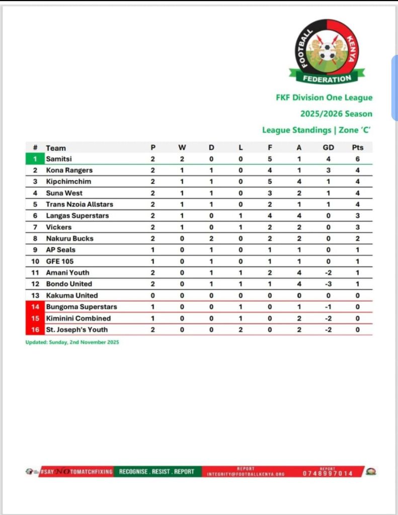 In Zone C, which comprises 12 teams hailing from both Malava and Navakholo Sub-Counties, the competition has reached an exciting point. At the bottom of the table, Lukova FC has already faced the unfortunate fate of relegation, unable to play enough matches to stay afloat. On the other hand, Tumaini FC is currently dominating the league, sitting proudly at the top with an impressive 34 points accrued after 15 matches, showcasing their remarkable consistency and skill on the pitch. Close on their heels is Bulupi FC, maintaining a strong hold on second place with 30 points from the same number of matches, demonstrating their tenacity and determination to challenge for the title. Completing the top three is Manyonje FC, who have earned 24 points after playing 14 matches, making their campaign noteworthy as they look to solidify their position. The competition for the third to sixth spots is particularly fierce, with only a slim 2-point margin separating the teams. At the fourth position, Tombo Foxes have managed to secure 23 points and are eyeing opportunities to climb higher, while Mukhungula FC, in fifth place, trails closely with 22 points, distinguished only by a single goal difference from Shamoni FC, who also share the same points tally at sixth place. Meanwhile, Shitirira FC occupies the seventh position, and following them are Navakholo Young Stars in eighth, alongside Forest FC in ninth. The relegation battle is particularly tense at the bottom; Mukavakava FC sits at tenth with only 5 points, Santos FC is in eleventh place with 4 points, and unfortunately, bringing up the rear at twelfth is Lukova FC, whose journey in this season has been fraught with challenges. As the league progresses, every matchday promises to be thrilling, with teams battling not just for points, but for pride and glory in this competitive environment.