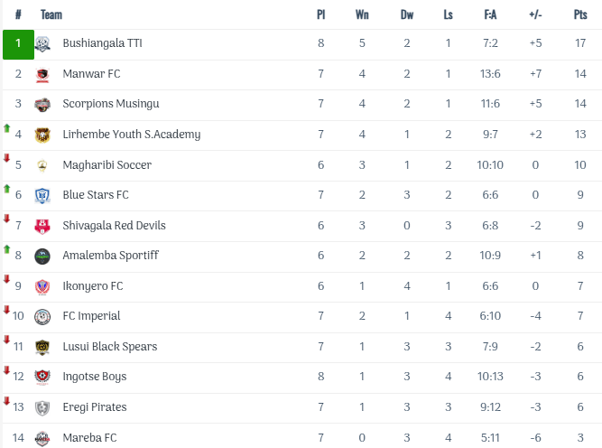 On Saturday, W. Christopher’s brilliant goal in the 25th minute secured Bushiangala TTI an impressive away win when they were hosted by Blue Stars FC at the familiar grounds of Approved School. This exciting match not only showcased the determination of both teams but also highlighted the growing competitive spirit in the league. Meanwhile, at Shiveye Secondary, Magharibi Soccer Academy faced off against Lusui Black Spears FC in a thrilling encounter that had fans on the edge of their seats. The hosts opened the scoring remarkably early with a stunning goal from A. Bravin in the 1st minute, setting the tone for what was to unfold. As if continuing a 1st-minute scoring pattern, S. Joseph doubled the hosts’ lead with a well-placed strike in the 46th minute, just as the second half was beginning. However, the visitors refuse to go down without a fight; M. Derrick managed to pull a consolation goal for Lusui Black Spears in the 83rd minute, reviving hopes for a comeback. Ultimately, the match ended with a final score of Magharibi Soccer Academy 2-1 Lusui Black Spears, further solidifying the hosts’ position in the league standings.
